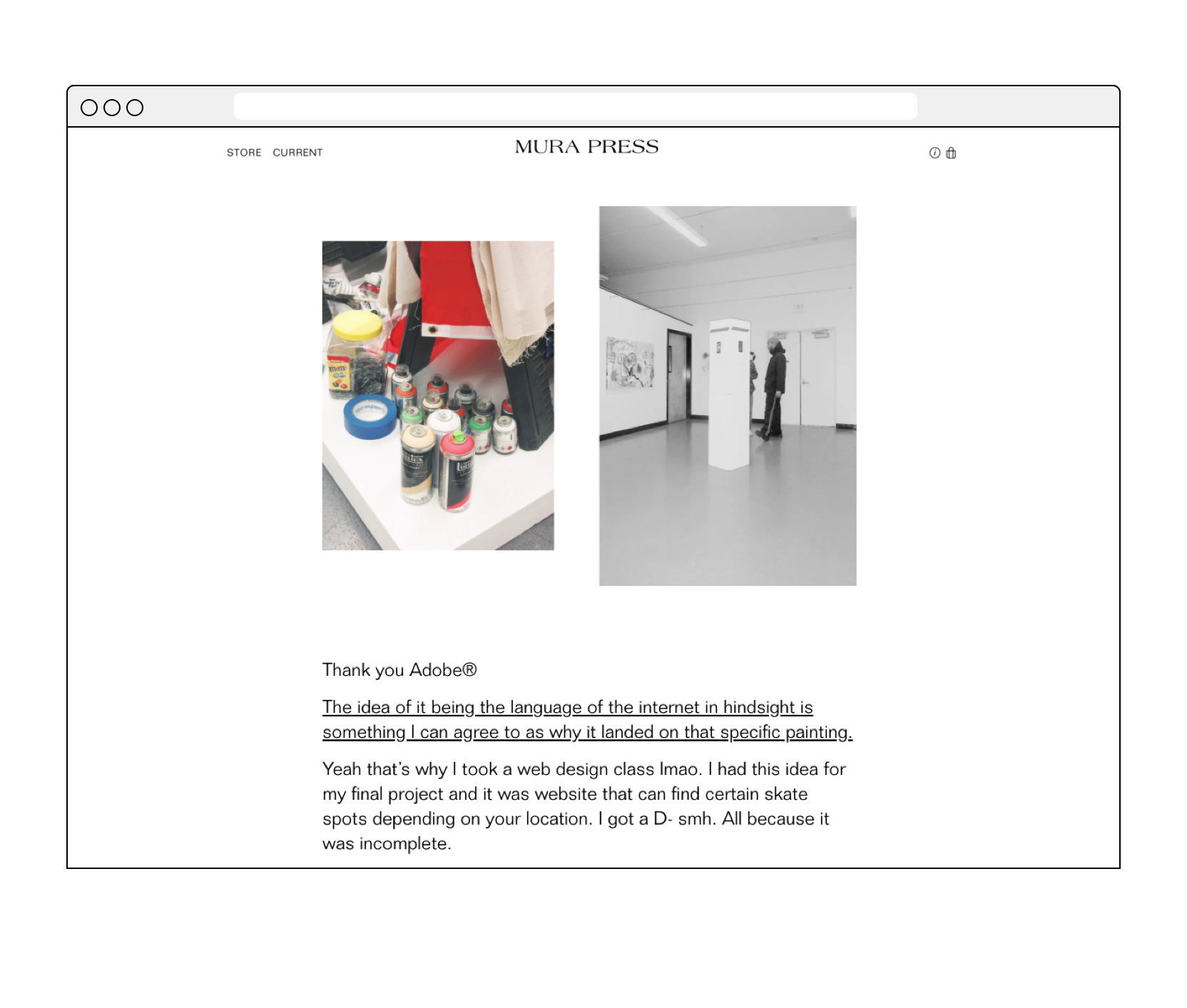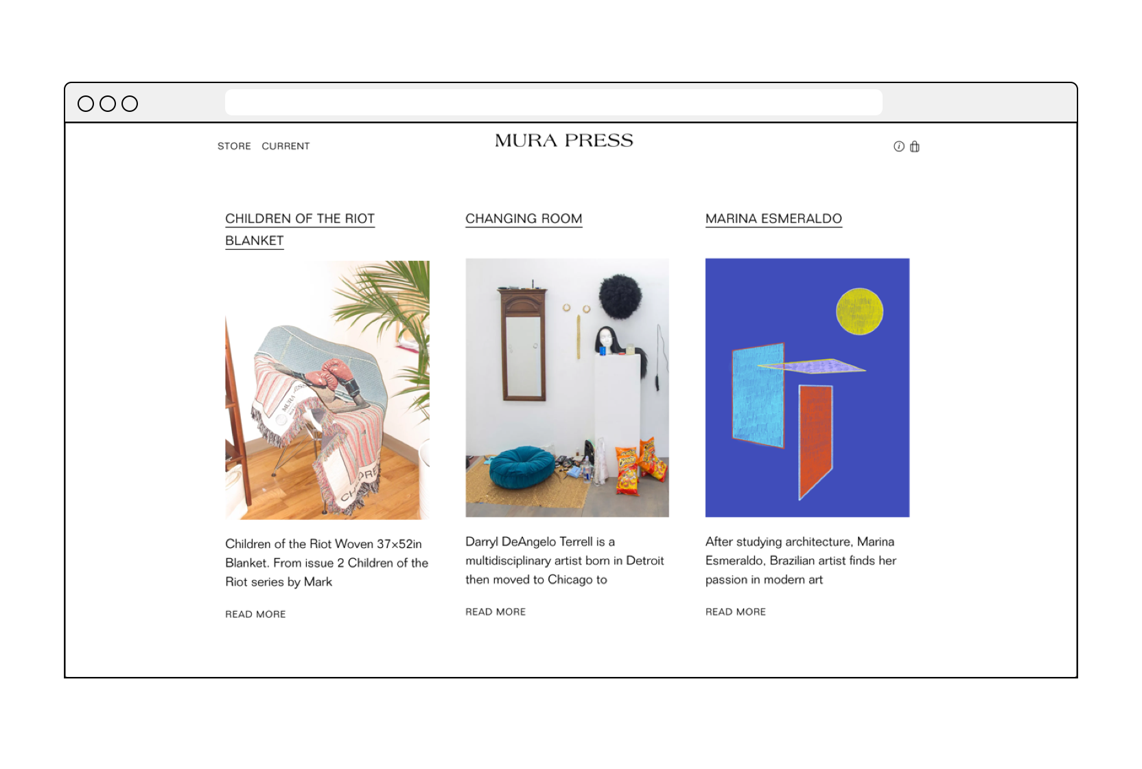 I ART DIRECTED MURA PRESS, A PRINT/ONLINE ART & DESIGN PUBLICATION THAT FOCUSES ON CONTEMPORARY WORK BY ARTISTS OF COLOR. EACH NEWSPRINT ISSUE FEATURES COLLABORATIVE OR NEW WORK WITH ONE ARTIST PER ISSUE. INTERVIEWS WRITTEN BY CAROLYN RHEE AND ME. I HAVE ALSO DESIGNED & DEVELOPED THE WEBSITE, LOGO & BRANDING, AS WELL AS PRODUCT & EDITORIAL PHOTOGRAPHY.