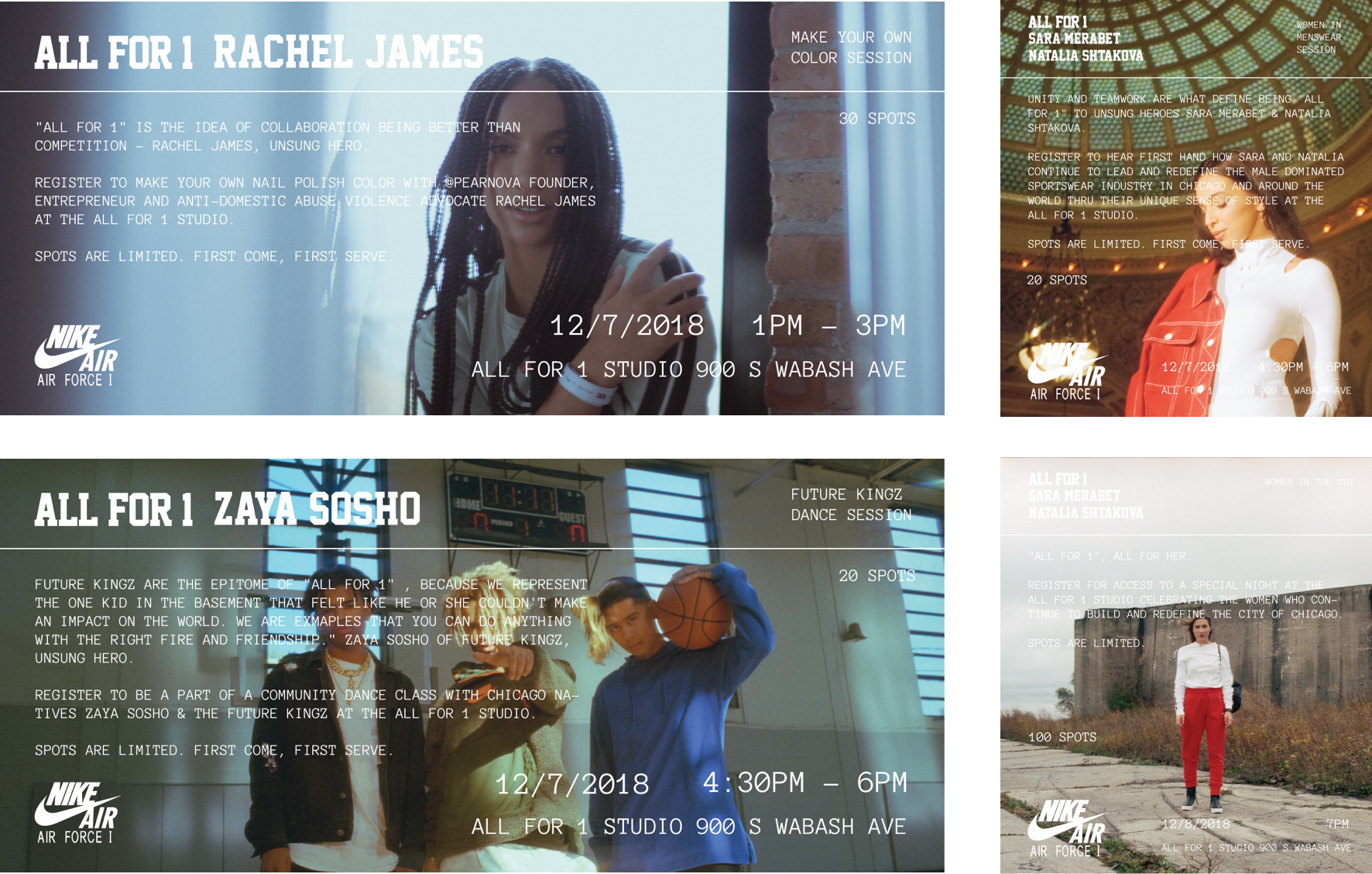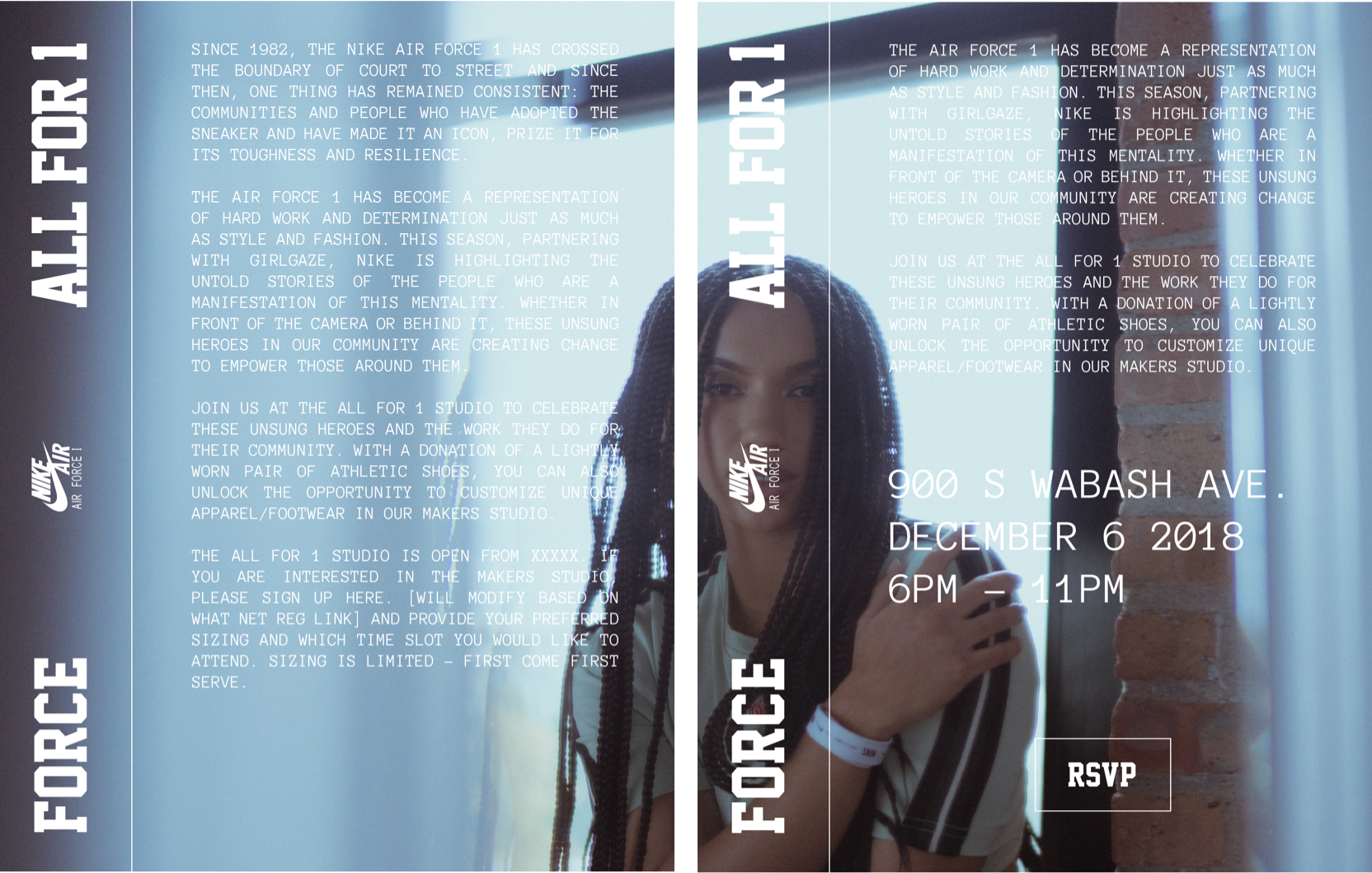 I WORKED WITH LIMITLESS CREATIVE CO. TO DESIGN PROMOTIONAL FLIERS & INVITATIONS FOR NIKE CHICAGO'S EVENT, "ALL FOR 1". BANNERS CREATED LIVED ON THE NIKE WEBSITE FOR THE 3 DAY EVENT. I ALSO HAD A HAND IN CREATING LARGE TEXT SIGNAGE FOR THE WORKSHOP.