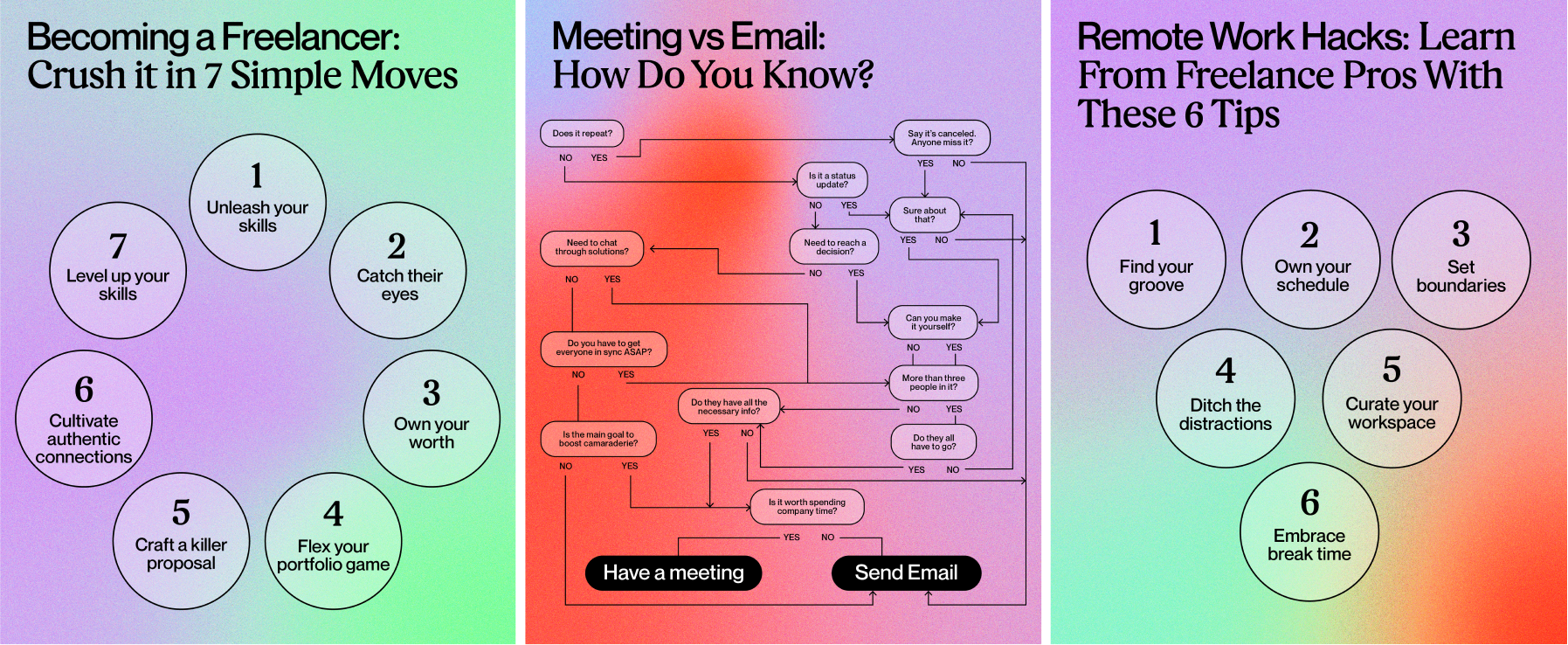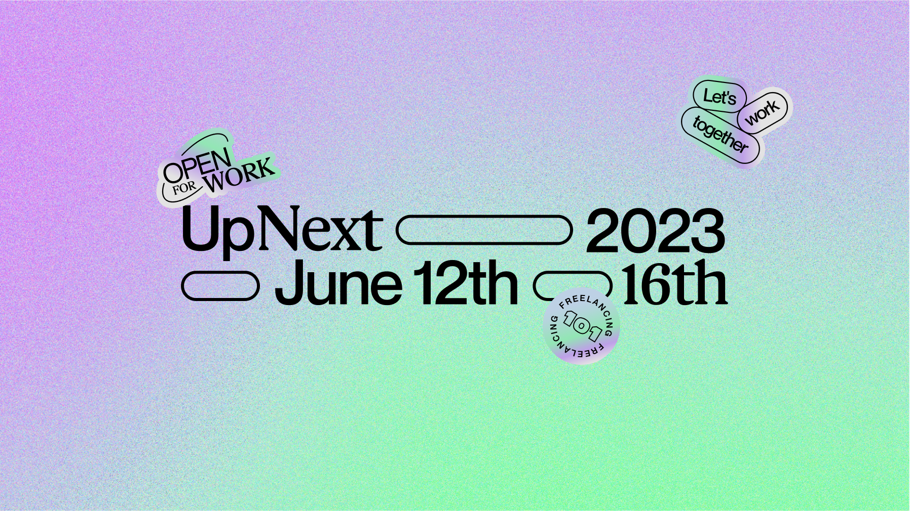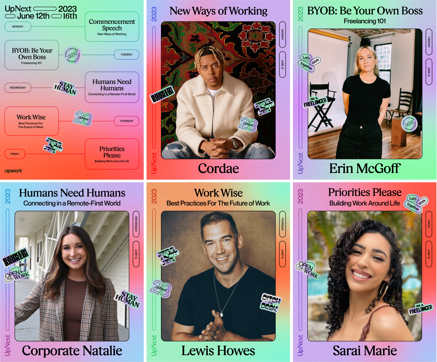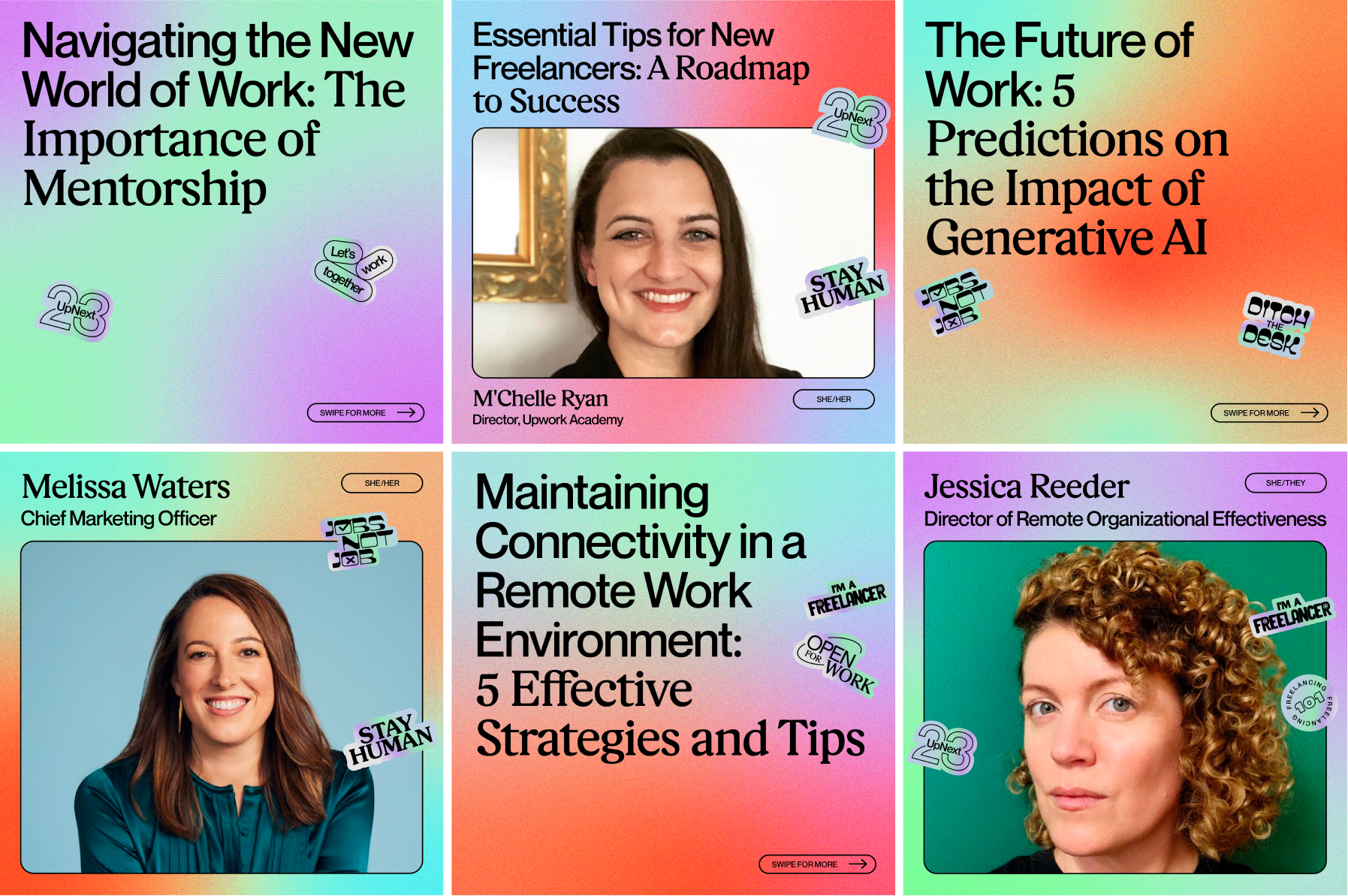I worked with Upwork's social team to brand an online/social campaign to encourage Gen Z to embrace freelancing. I designed the lockup, gradients, social media posts, as well as physical iridescent stickers.
